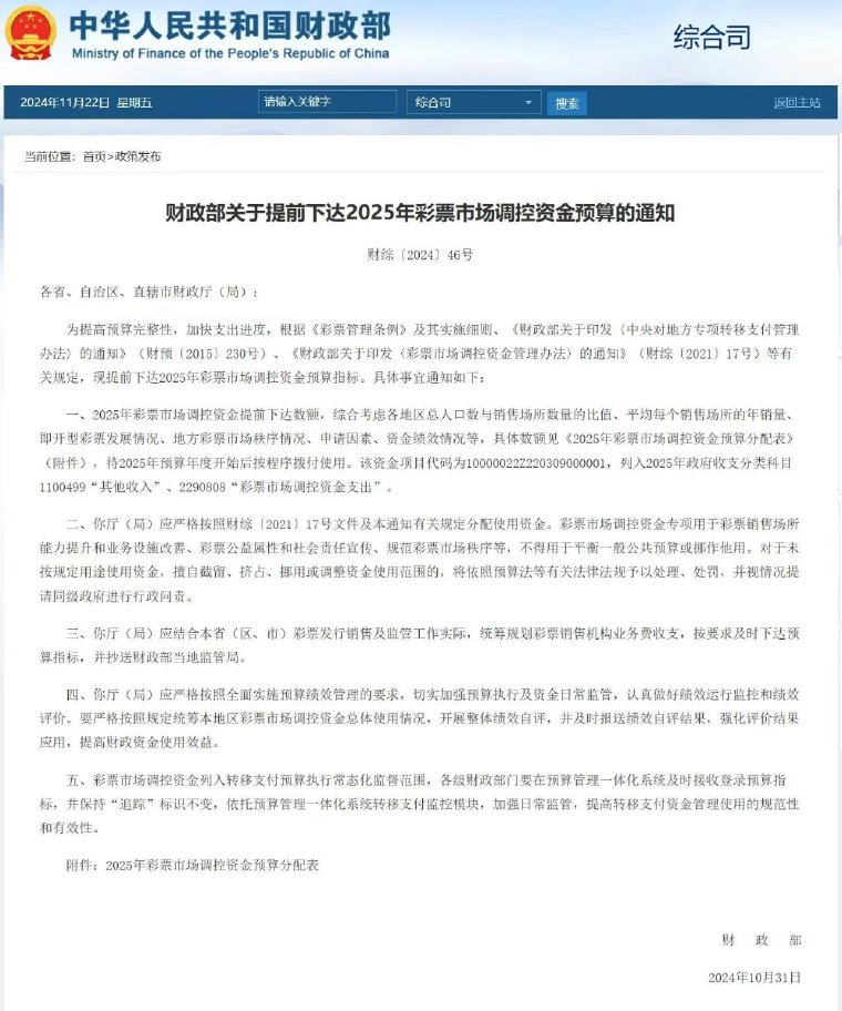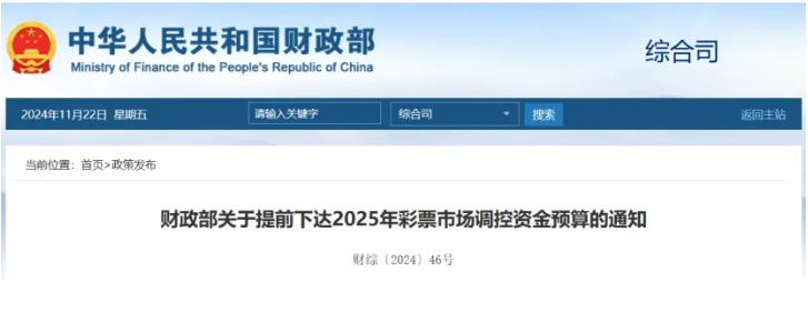 11月22日,财政部官网披露《财政部发布关于提前下达2025年彩票市场调控资金预算的通知》(简称“《通知》”)。《通知》指出,“明年彩票市场调控资金预算达11.89亿元。”该笔资金是全国各地彩票机构未来一年安排工作的重要资金,对市场风向具备指导意义。