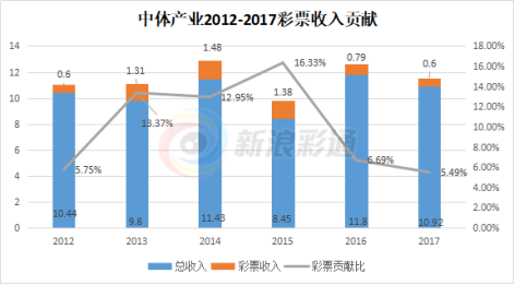 而实际上,彩票收入对集团总收入的贡献并不大,2017年下滑至5.49%,甚至低于2012年刚刚开展彩票业务时的水平。