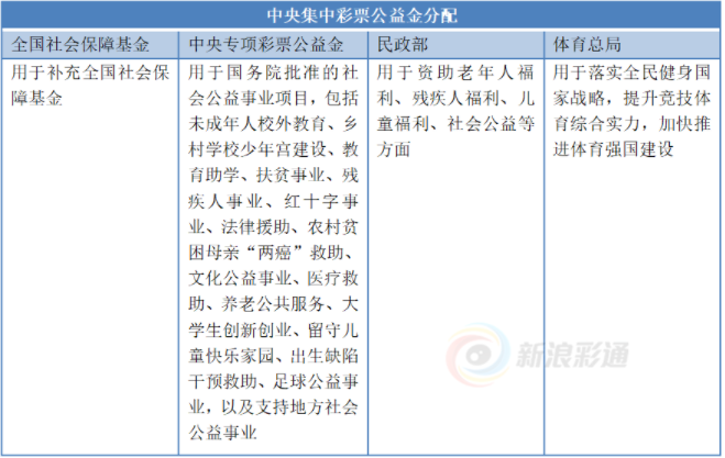 根据国务院批准的彩票公益金分配政策,彩票公益金在中央和地方之间按各50%的比例分配,专项用于社会福利、体育等社会公益事业。其中,中央集中彩票公益金在全国社会保障基金、中央专项彩票公益金、民政部和体育总局之间分别按60%、30%、5%和5%的比例分配,分别用于数十个方向。