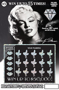 据了解,该票种整体上采用怀旧的黑色调。封面上部印有玛丽莲·梦露的头像,封面下部右则区域则印有15个玛丽莲·梦露经典的掩裙动作图案,即意味着有15次中奖机会。封面下部左侧中奖区域则是5个嘴唇图案。刮开下部两侧图案数字,如有吻合便可中得对应奖金,最高5万美元。